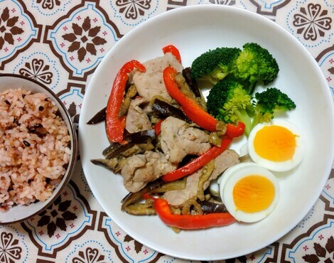 塩麹に漬けた豚肉とナス、パプリカ炒め