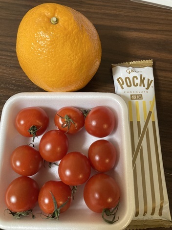 ホテル一室朝ご飯。昨日の朝ご飯はミニトマトでしたが、今日は豪華にいよかんもあります。一応お菓子もありますが甘い物が欲しくなければ、このままカバンに入れて道中のおやつにします。