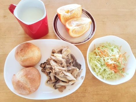 プチフランス、きのこのマヨソテー、サラダ、いよかん、ホットミルク