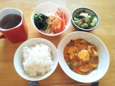ごはん、鶏のチリソース煮、大根サラダ、ゆで小松菜