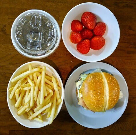 テリヤキ目玉サンド、フライドポテト、イチゴなどを食べました