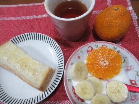 朝 トースト(バター&はちみつ)、レモンティー、バナナと不知火のヨーグルト