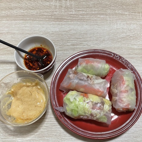 今日はキャベツ人参豚肉を蒸したものを生春巻きの皮でつつみ
