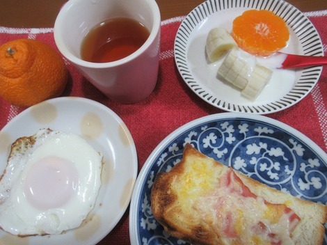 ベーコンチーズトースト、目玉焼き、紅茶、ヨーグルト、不知火