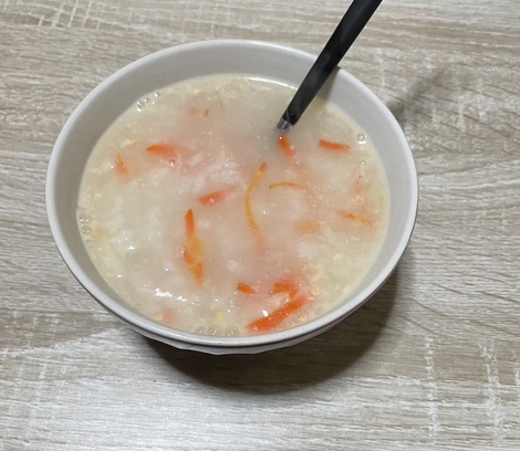 中華粥鶏がらスープにニンニク、生姜、人参大根が入ったの