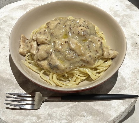 お昼は塩麹ムネ肉と豆乳マスタードクリームパスタ