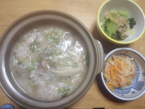 雑炊、茹で小松菜、なます