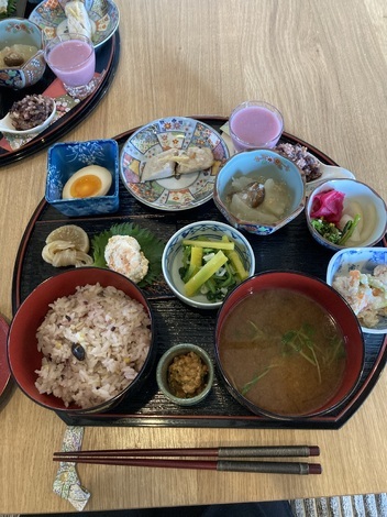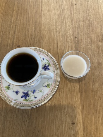 一昨日行ったお昼ご飯があまりに美味しかったので今日は家族とともに35km先の食事処へ行きました。変わり映えしないメニューですみませんとお店の方。いえいえ、この麹をたっぷり使ったミニハヤシ付き御膳を食べたくて予約したのです。食後のコーヒーは半分はブラックで、残り半分に甘酒を入れてカフェ・オ・レのようにしていただきます。