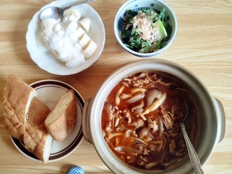 フランスパン、牛肉のスープ、ゆで小松菜、バナナヨーグルト