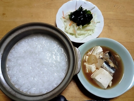 粥、いわしと豆腐の煮物、大根サラダ