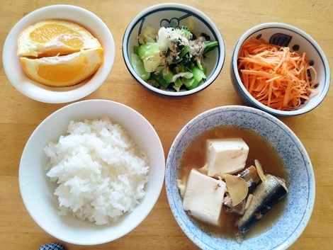 ごはん、いわしと豆腐の煮物、キャロットラペ、ゆで小松菜、いよかん