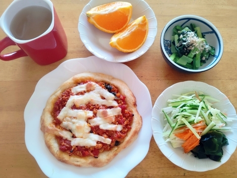 ピザ、大根サラダ、ゆで小松菜、不知火