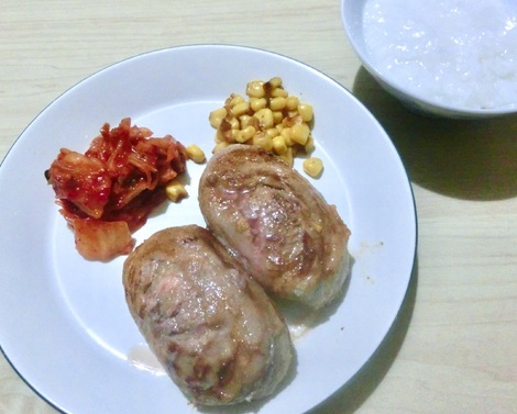 お粥、ハンバーグ、キムチ、コーンを食べました。