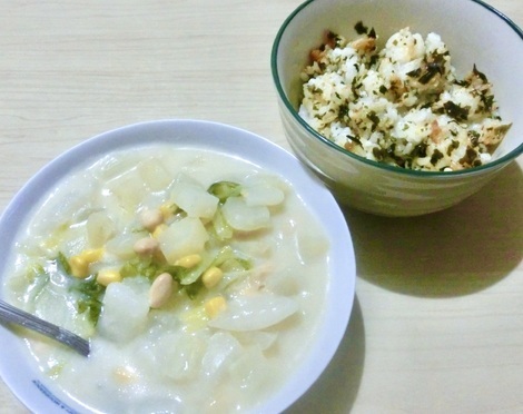 混ぜご飯、シチューを食べました。