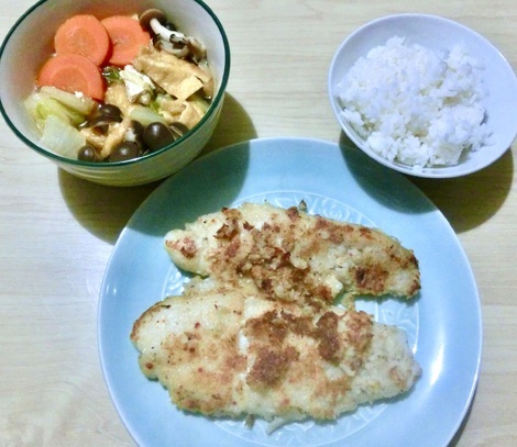 ご飯、白身魚のオニオン&ガーリック焼き、鍋料理を食べました。