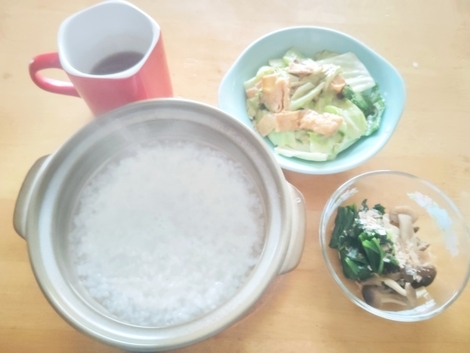 粥、キャベツと油揚げの醤油マヨソテー、ほうれん草