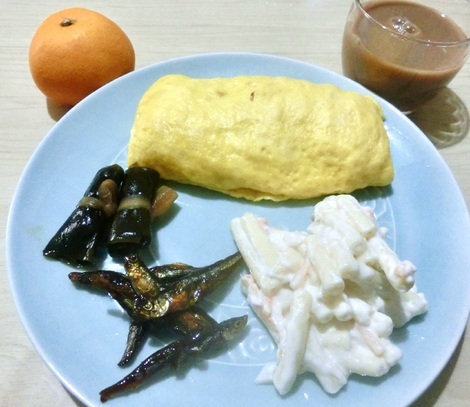 冷食オムライス、マカロニサラダ、ワカサギの甘露煮、昆布巻き、