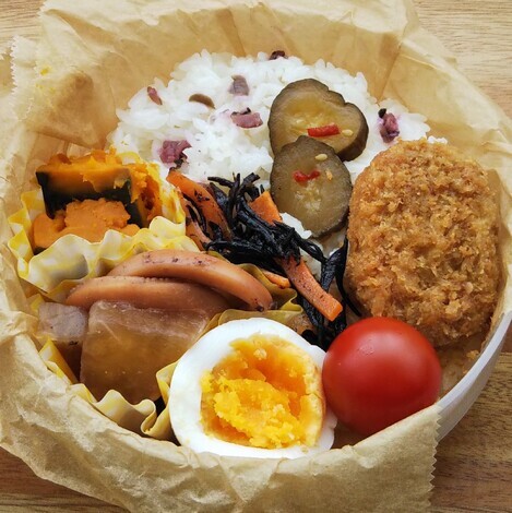 手作りQちゃん漬け、南瓜の煮物、ひじき煮、烏賊と大根の煮物、ゆで卵、ミニトマト、自然解凍のメンチカツでした♪