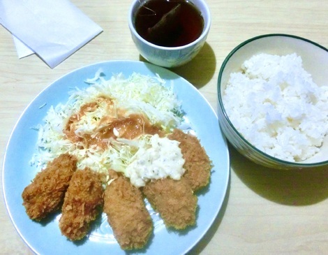 ご飯、カキフライ、千切りキャベツを食べました。