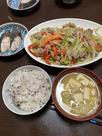 関西5日間の旅を終えて帰宅した日の夜ご飯。夫が野菜炒めと焼き魚を作ってくれました。ありがたい。