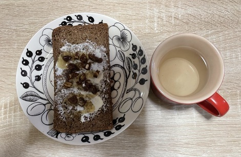 朝食はビオフォルコンブロートにクリームチーズとデーツとハチミツかけて、よもぎ茶