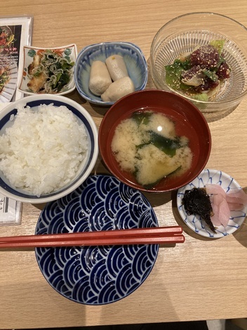 中古の冷蔵庫を関西に運んだ度2日め。実家住みのこどもは昨夜ご飯を食べて車で愛知県行くよーと車で出発したので、夫と関西住みのこどもと3人で行動。お昼ご飯はおまかせおばんざい2種とお造り定食、夫とこどもは肉豆富定食でした。