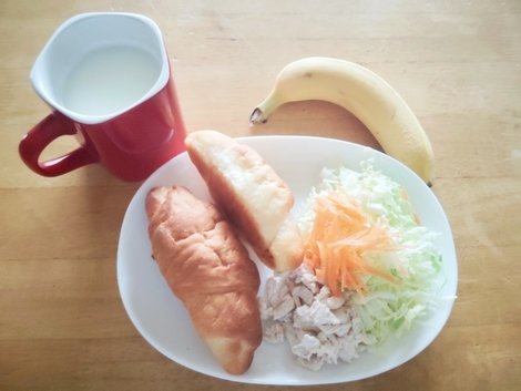 塩パン、サラダ、チキンサラダ、バナナ、ホットミルク