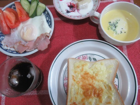 チーズトースト、コーンスープ、アイスコーヒー、ベーコンエッグ、ヨーグルト