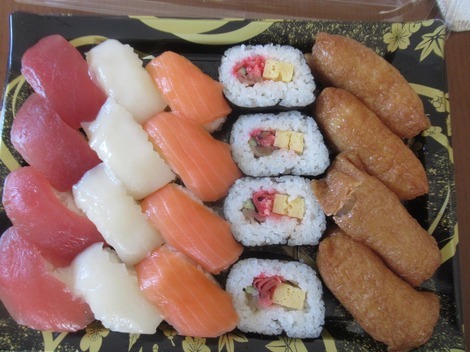 お昼はスーパーで買ったお寿司です。あとはトマトと緑茶