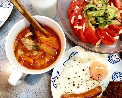 朝ごはんに、トマトサラダ&トマトスープです🎐🐭🍅