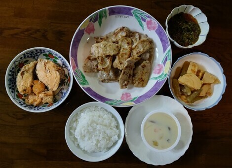 豚肉のガーリックソテー、タケノコの煮物、茶わん蒸しなどを食べました