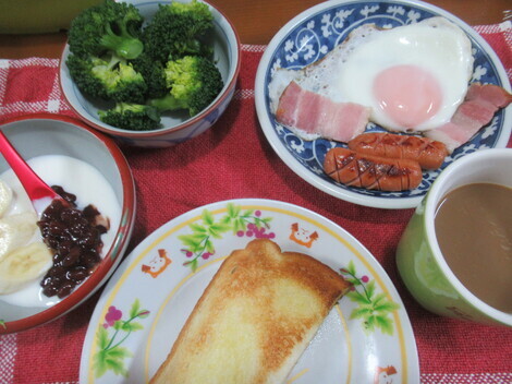 トースト、コーヒー、目玉焼き、ベーコン&ソーセージ、、ブロッコリー、ヨーグルト