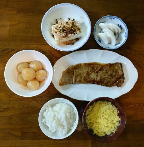 ステーキ、玉こんにゃく、冷や奴などを食べました