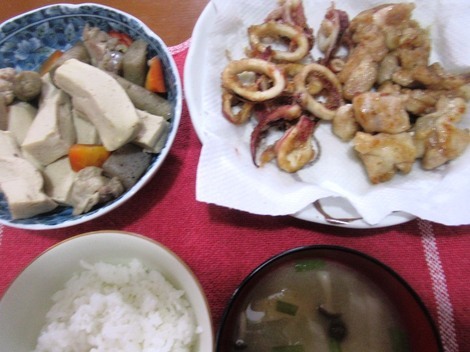 鶏とイカのから揚げ、うま煮、大根のお味噌汁、リンゴ