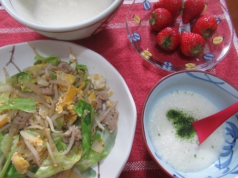 とろろご飯です。肉野菜炒めとイチゴ。デコポンも