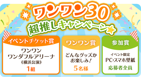 ワンワン30★超推しキャンペーン☆「ワンワン ワンダフルアリーナ」チケットなど当たるチャンス!【イベント】