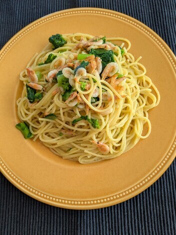 菜の花、桜エビ、今日はちょうどランチに菜の花と桜エビのパスタを作りました。