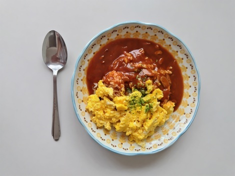 ハヤシライスにマヨネーズと塩を入れて軽く炒めた卵をのせてみました(*^_^*)