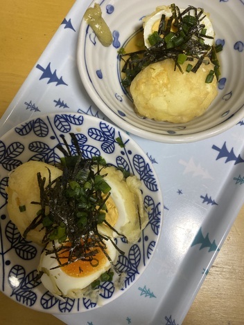 夜は卵の揚げ出し卵にして使い切り😆初めて作りましたが、簡単で美味しかった🌟