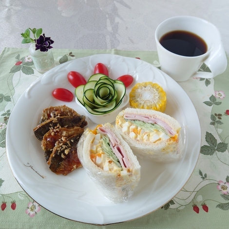 お昼にマヨたま、きゅうり、ロースハムのボリュームサンドを作りました😋