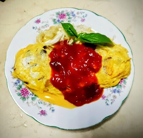 マッシュルーム、花びら茸、しめじ、エノキ。チーズに生クリームもたっぷり入れてとろとろに。トマトソースもたっぷりかけて…と、どんどん欲張りすぎて、コロコロまん丸オムレツになりました。お皿が小さい😅