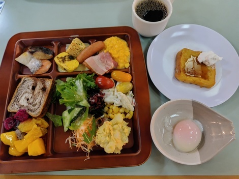 朝食に温泉卵、スクランブルエッグ、卵焼きを食べました。