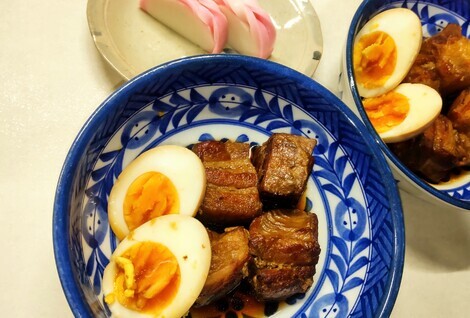 豚の角煮の煮汁でたくさんの半熟ゆで卵を漬け込みます
