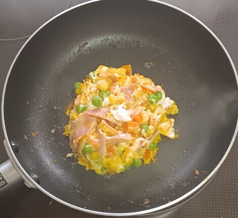 今日はいつものベーコンと卵にミックスベジタブルを加えて作りました。