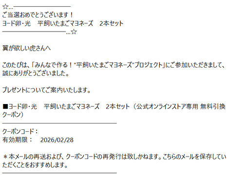 当選メール届きしました。ありがとうございます。
