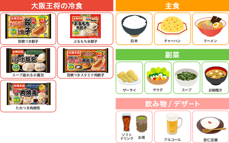 下のパネルにある、「大阪王将の商品」から1商品と、その他「主食」、「副菜」、「飲み物 / デザート」の中から2つ(計3種類)を組み合わせ、お好みのメニューを作成!そのメニューを考えた理由や背景や、誰とどんな時に食べたいかなどを投稿してください♪