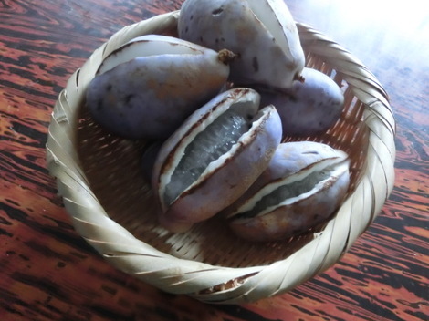 一般的にアケビと言うと中の甘い白い部分を食べるのですが、山形では皮を食べます。中身は種が多くて食べるのが面倒なので、捨ててしまうことが多いです。