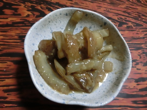 アケビの皮のほろ苦さが味噌と相まってとてもおいしく、まさに旬を感じさせるもので秋の夜長に最高の酒の肴です。