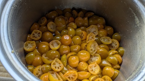 種を取り出した金柑は、お酒と氷砂糖に浸けて「金柑酒」か、甘く煮て保存食の「甘露煮」かな…と思っていたら…