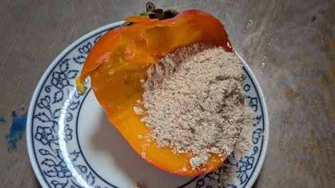 干し柿を半分に切って、麦こがし(はったい粉)を挟んで食べる方法を初めて知りました…🙀!